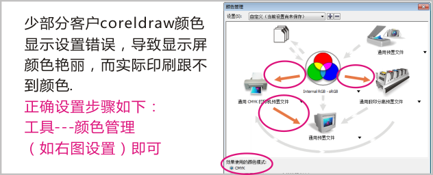 少部分客戶coreldraw顏色顯示設置錯誤,導致顯示屏顏色艷麗,而實際印刷跟不到顏色.