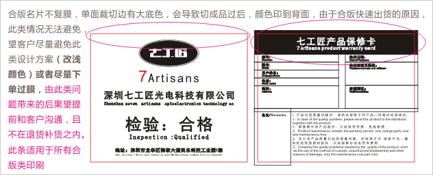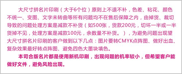 合版名片不復膜,單面裁切邊有大底色,會導致切成品過后,顏色印到背面,由于合版快速出貨的原因,此類情況無法避免, 望客戶盡量避免此類設計方案(改淺顏色)或者盡量下單過膜,所有合版類產(chǎn)品(合版名片、單張)由此類問題帶來的后果望提前和客戶溝通,且不在退貨補貨之內(nèi)。