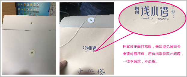 檔案袋正面打雞眼,無法避免背面會出現(xiàn)雞眼壓痕,所有檔案袋因此問題,一律不減款,不退貨。